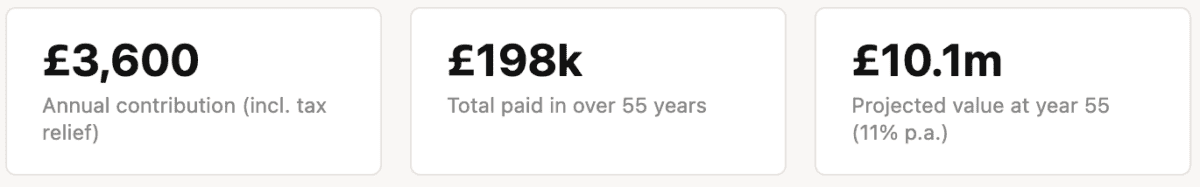 メカニズムはシンプルだが強力です。両親と祖父母は、子供のSIPPに年間最大£2,880まで支払うことができ、子供が税金を払わなくても、政府は20%の減免を加えて年間総寄与額が£3,600になります。それはすべてです。これが全体的な戦略です。
