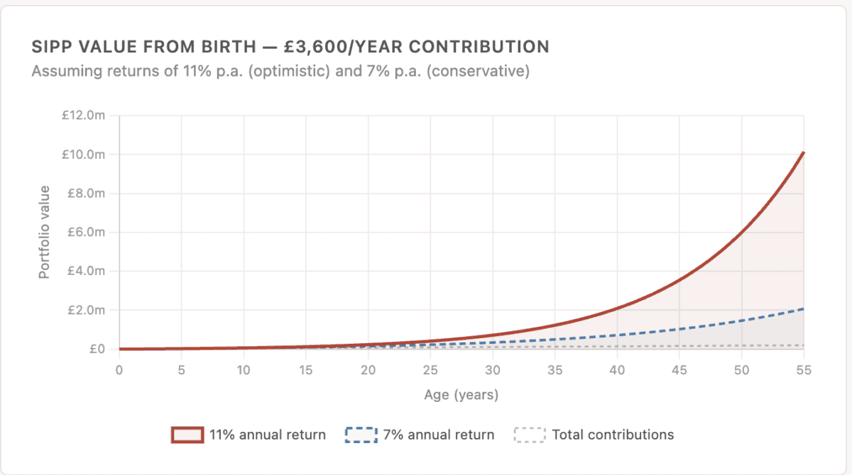 両親は子供の自己投資個人年金(SIPP)に年間£2,880を支払うことができ、政府はそれを最大£3,600まで支払います。十分な時間があれば、結果は素晴らしいです。